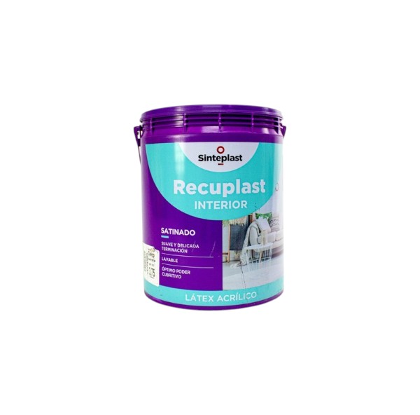 Recuplast Interior Satinado es una pintura al látex para uso interior altamente decorativa. Deja una terminación semibrillosa plastificada suave al tacto, que refleja la luz y jerarquiza cualquier espacio. Es súper lavable y tiene óptimo poder cubritivo. Es apto para aplicar sobre revoque, yeso, mampostería, placas de yeso. Se aplica muy fácilmente, tiene buena nivelación y mínimo salpicado. Presentación: 1, 4, 10 y 20 lts. Color blanco y tonalidades pasteles con el sistema tintométrico.